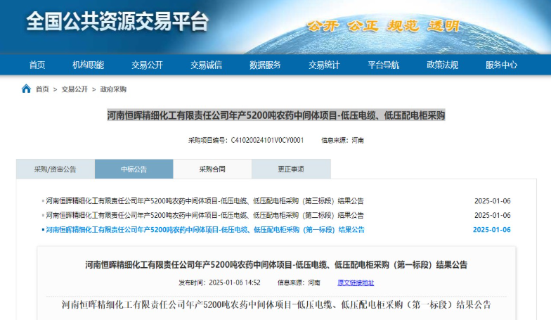 河南勝華電纜集團(tuán)中標(biāo)河南恒暉精細(xì)化工有限責(zé)任公司262萬(wàn)電纜采購(gòu)項(xiàng)目